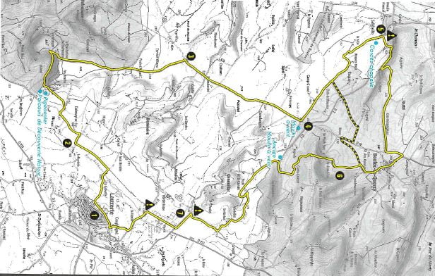 Habituellement cette randonnée débute Promenade de l'Eveillée dans le village de Lauzerte et rejoint la route qui mène au Belvédère. Vous pouvez partir directement de l'hôtel, il suffira seulement de rejoindre la boucle en empruntant la route goudronnée qui mène au Belvédère en sens inverse. Il est conseillé de réaliser ce parcours en VTT (environ 2h). Reprendre la route jusqu'au croisement à environ 400m. 200m plus loin, prendre à droit un chemin, toujours sur le plateau. Au bout de 800m, rejoindre une autre route « Le Clermontois » (ancienne voie romaine reliant Agen à Cahors), à emprunter à droite sur 2km, jusqu'au château d'eau. Juste après ce château d'eau, flanqué de l'ancien moulin à vent restauré de « Pertenaïs » tourner à gauche. On aperçoit le village de Bouloc sur la droite. Après une succession de chemins et de voies bitumées, descendre dans la vallée de la Séoune par un petit sentier à travers les chênes. Le sentier continue à descendre jusqu'à la chapelle de Carcès.